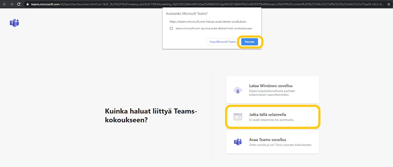 Kun avaat ajanvarauksen vahvistusviestin lopussa olevan kutsulinkin, aukeaa selaimeen kuvanmukainen näkymä. Jos näytölle pomppaa pieni ikkuna Teams-sovelluksesta, klikkaa ensin ”Peruuta”. Siirry Teamsin selainversioon klikkaamalla ”Jatka tällä selaimella”.