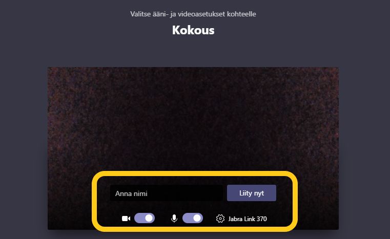 Salli kameran ja mikrofonin käyttö, jos selain kysyy sitä. Kirjoita ”Anna nimi”-kenttään etunimesi sekä varaamasi haastatteluaika, esim. "Enni 13:30". Älä kirjoita koko nimeäsi! Varmista napeista nimikentän alla, että videokuva ja ääni ovat päällä. Lopuksi paina ”Liity nyt”, mikä siirtää sinut virtuaaliseen odotusaulaan.