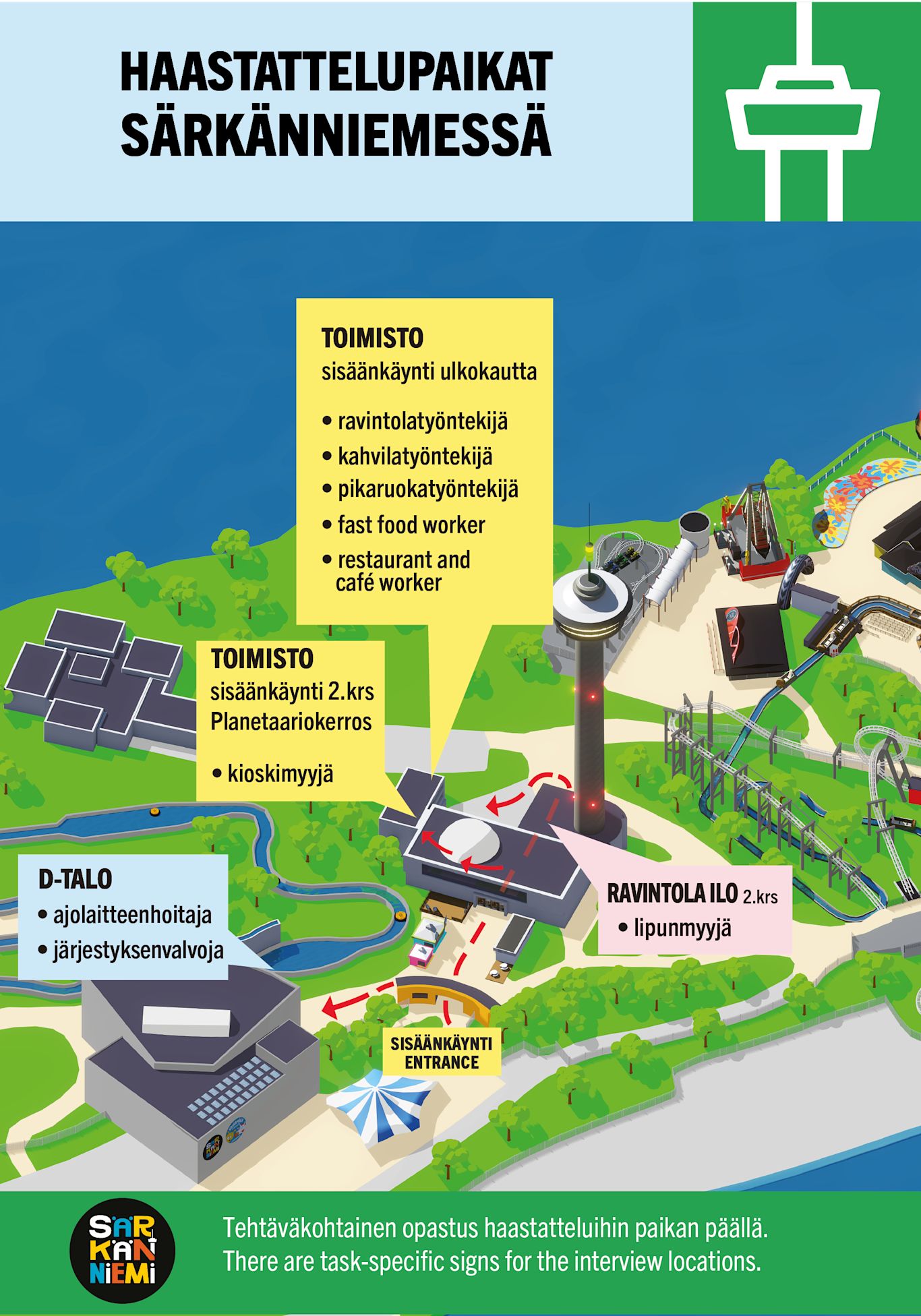Särkänniemessä työtehtäväkohtaiset opasteet haastattelupaikoille ja kaikki paikalle tulevat hakijat haastatellaan saapumisjärjestyksessä.